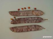 干燥荚果呈长条形而扁,或稍弯曲,长15~25cm,宽2~3.5cm,厚0.8~1.4cm。表面不平,红褐色或紫红色,被灰白色粉霜,擦去后有光泽。两端略尖,基部有短果柄或果柄断痕,背缝线突起成棱脊状。质坚硬,摇之有响声。剖开后呈浅黄色,内含多数种子。种子扁椭圆形,外皮黄棕色而光滑,质坚。气味辛辣,嗅其粉末则打喷嚏。