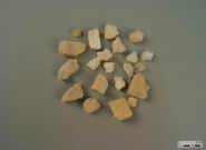 本品为不规则的片块或颗粒,大小不一。表面灰蓝色、灰黄色或灰白色,有的洁白色,半透明;略带光泽。体轻,质硬而脆,易破碎,吸湿性强。无臭,味淡。