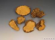 块茎为圆形或类圆形的片子,横径2.5~6cm,长径4~7cm,厚0.5~1.5cm。表面棕黑色,有皱纹,密布短小的支根及黄白色圆形的支根痕,微突起,直径约2mm,一部分栓皮脱落,脱落后显露淡黄色而光滑的中心柱。切面淡黄色至黄棕色,平滑或呈颗粒状的凹凸不平。质坚硬,易折断,断面平坦或呈颗粒状。气微,味苦。