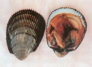 略呈三角形或扇形,长4~5cm,高3~4cm。壳外面隆起,有棕褐色茸毛或已脱落;壳顶突出,向内卷曲;自壳顶至腹面有延伸的放射肋30~34条。壳内面平滑,白色,壳缘有与壳外面直楞相对应的凹陷,铰合部具小齿1列。质坚。无臭,味淡。